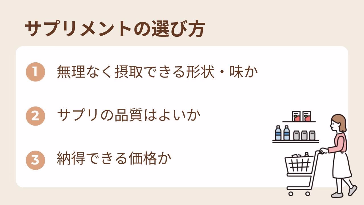 サプリメントは継続して摂取しなければ、なかなか効果を得られないため、飲みやすい形状や味の商品を選択しましょう。