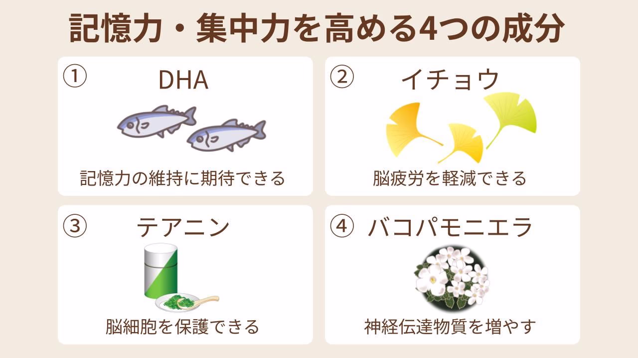 サプリを摂取して記憶力や集中力を改善したい方は、以下の成分が含まれているかどうかを確認するとよいでしょう。