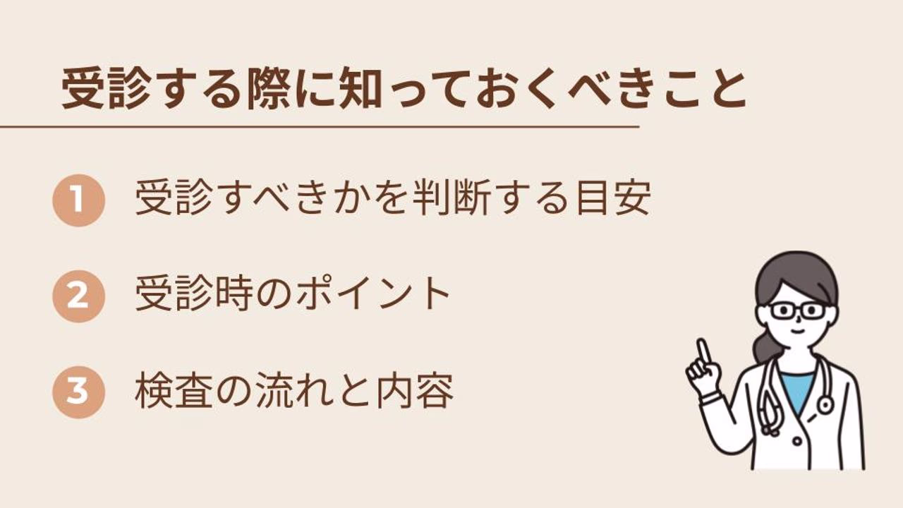 ここでは、受診すべきかどうかの判断目安や、実際に病院へ行く際のポイント、検査の具体的な内容について解説します。