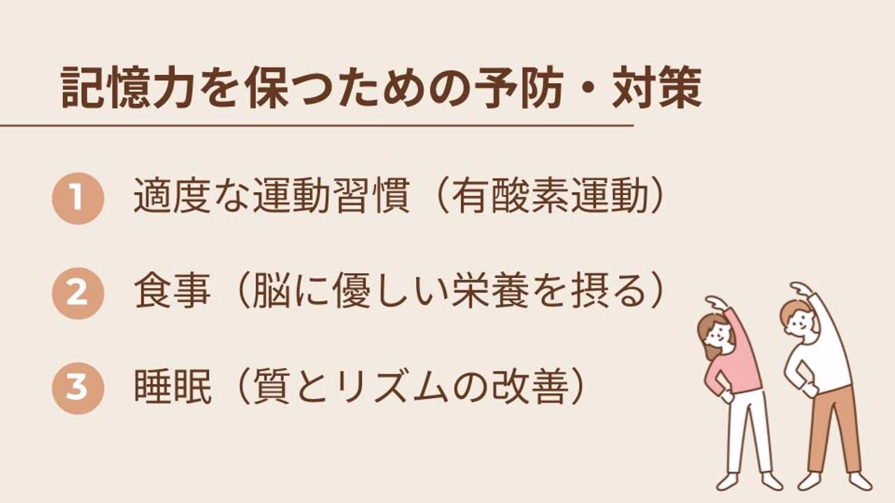 ここでは、今日からでも始められる、記憶力を保つための具体的な予防・対策について、3つの側面からご紹介します。