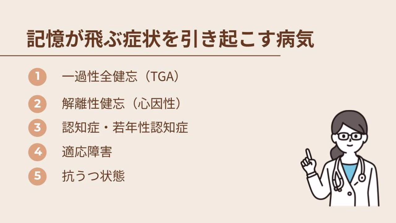 - 記憶が飛ぶ症状を引き起こす可能性のある病気