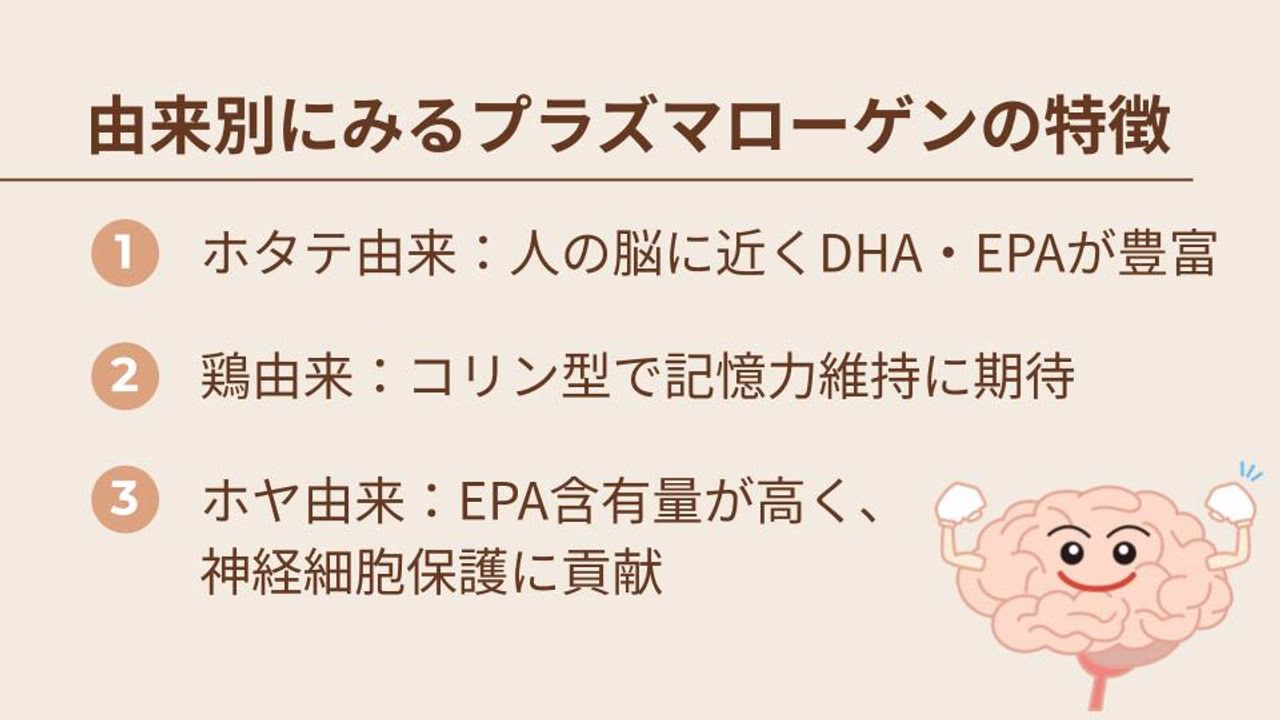 プラズマローゲンはその由来によって、含まれる成分や体への働き方が異なります。ここでは、各由来の違いを比較しながら、自分に合ったプラズマローゲンの選び方をわかりやすく解説します。