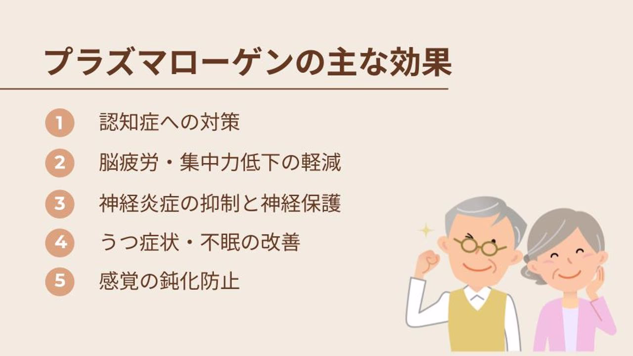 神経細胞の保護や炎症の抑制、うつ症状や感覚の鈍化の予防にも関与するなど、プラズマローゲンは脳の健康を守るうえで多方面に働きかける注目成分です。