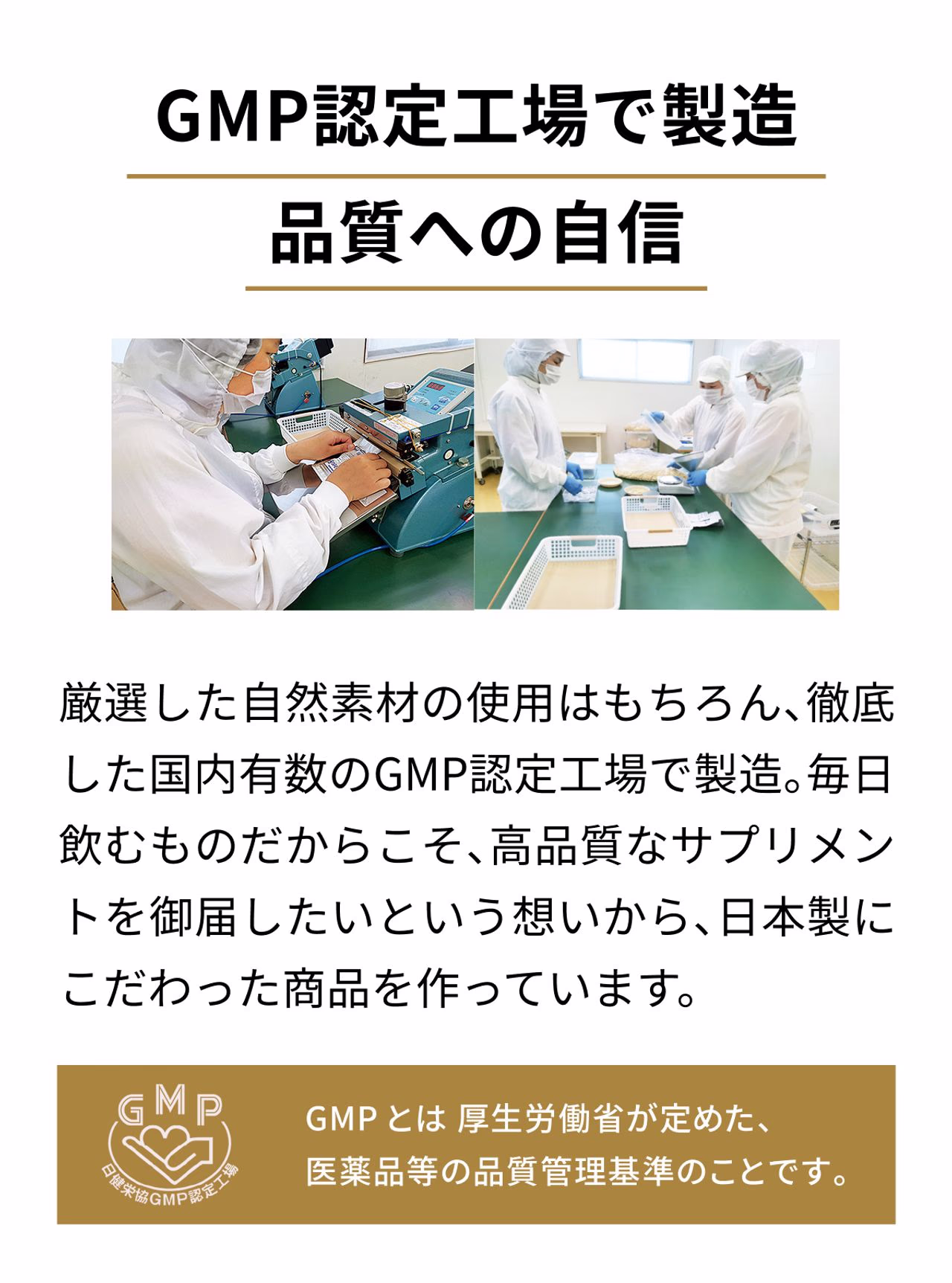 製造はGMP認定工場で行われ、添加物は一切不使用。