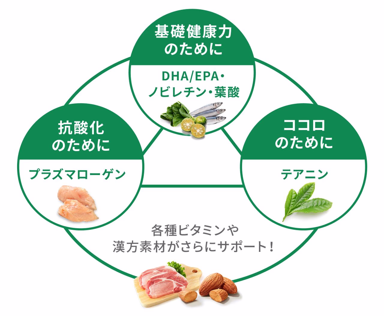 DHA・EPAを合計534mgと高水準で配合しているほか、プラズマローゲンやビタミンE、葉酸など20種類以上の栄養素をバランスよく含んでいます。
