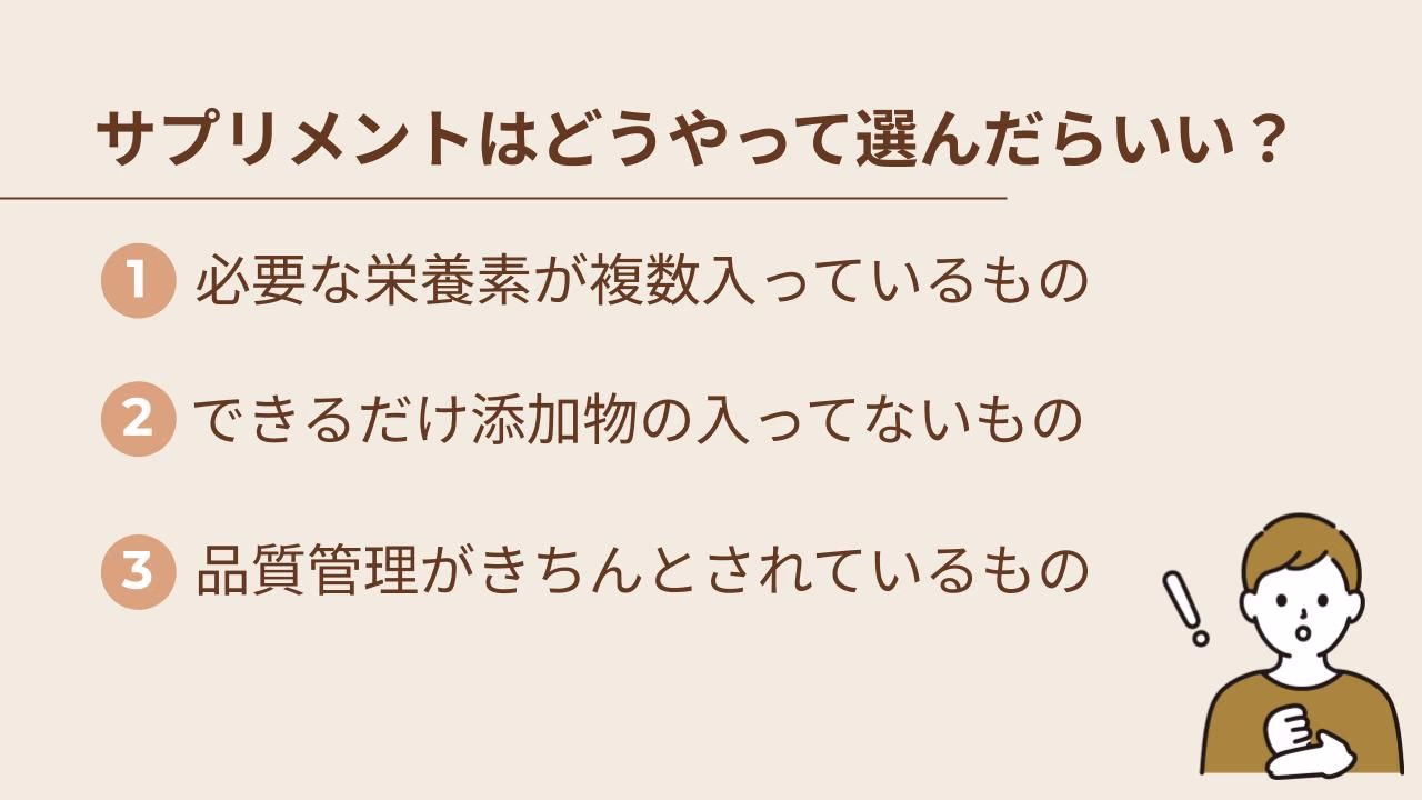 「よく見かけるから」「価格が安いから」といった理由だけで安易に選ぶと、摂取したい栄養素が含まれていなかったり、続けられなかったりするかもしれません。ここでは、サプリメントの選び方のポイントを解説します。