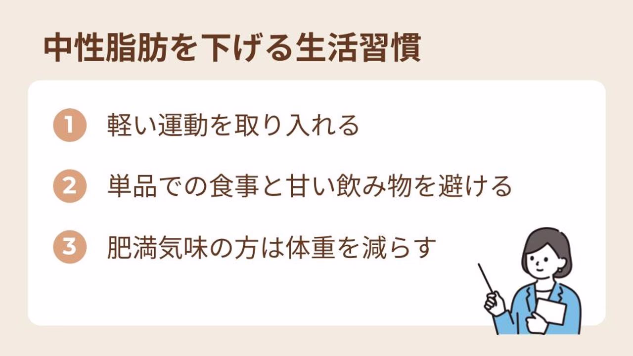 中性脂肪を下げやすくするには、軽い運動を日常に取り入れる、食事の摂り方を工夫する、体重管理に力を入れることが近道の一つです。