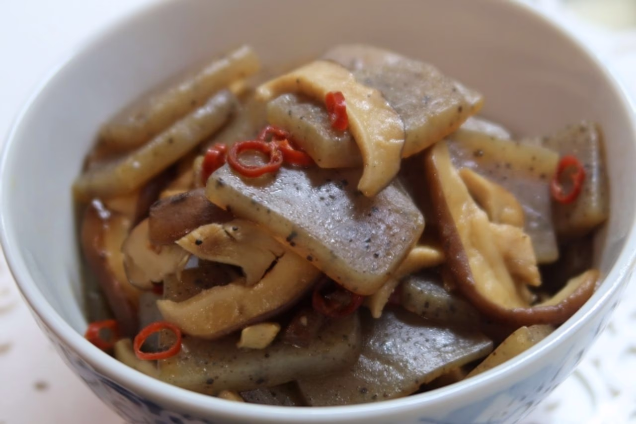 食物繊維を豊富に含むこんにゃくときのこを合わせた、簡単な副菜です。咀嚼回数が自然と多くなり、満足感が得やすいのも特徴です。