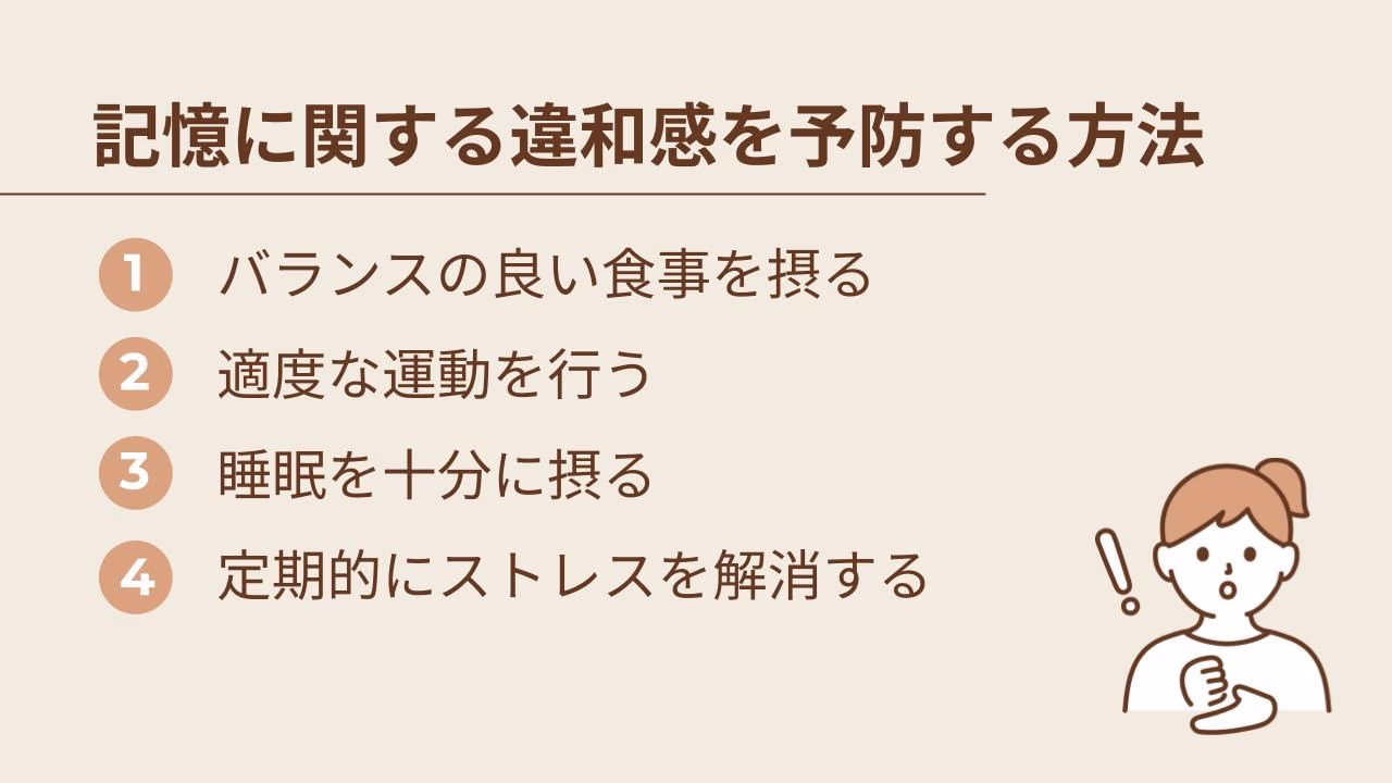 睡眠時間を確保し、寝る時間と起きる時間を一定に保つことで、記憶障害の予防につながります。
