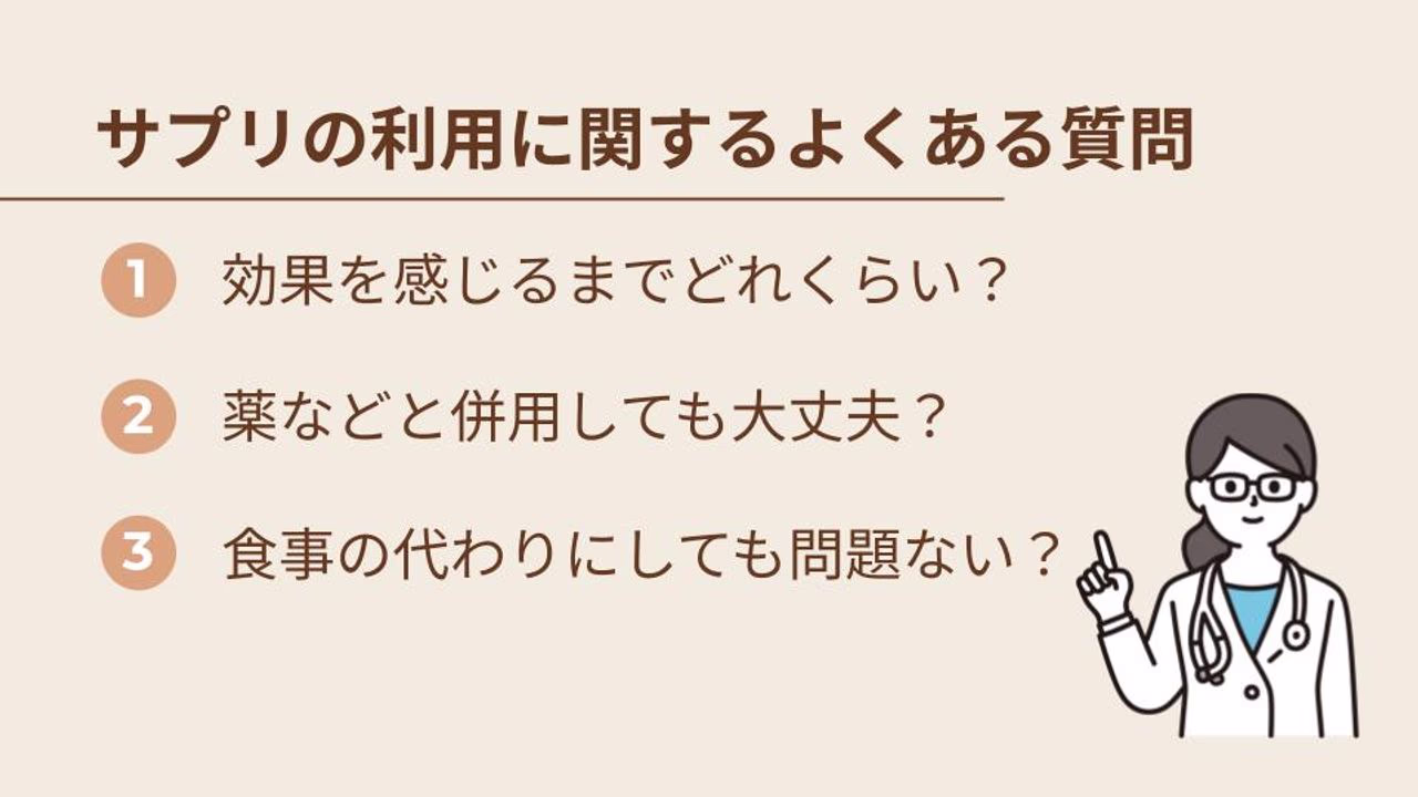ここでは、サプリを利用するにあたって多くの方が抱きがちな、よくある質問にお答えしていきます。