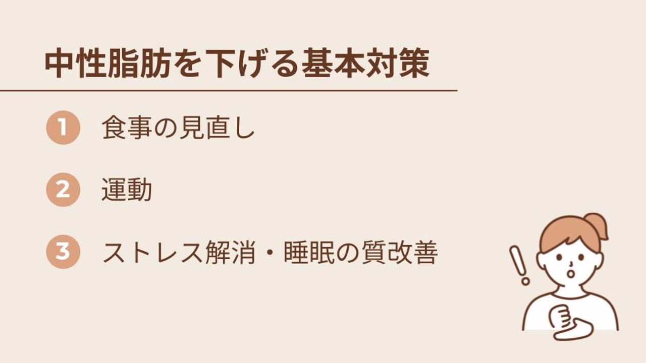 中性脂肪を下げるために最も大切なのは、特別な治療や極端な制限ではなく、毎日の生活習慣を少しずつ整えることです。ここでは、今日から意識できる「3つの基本対策」を紹介します。