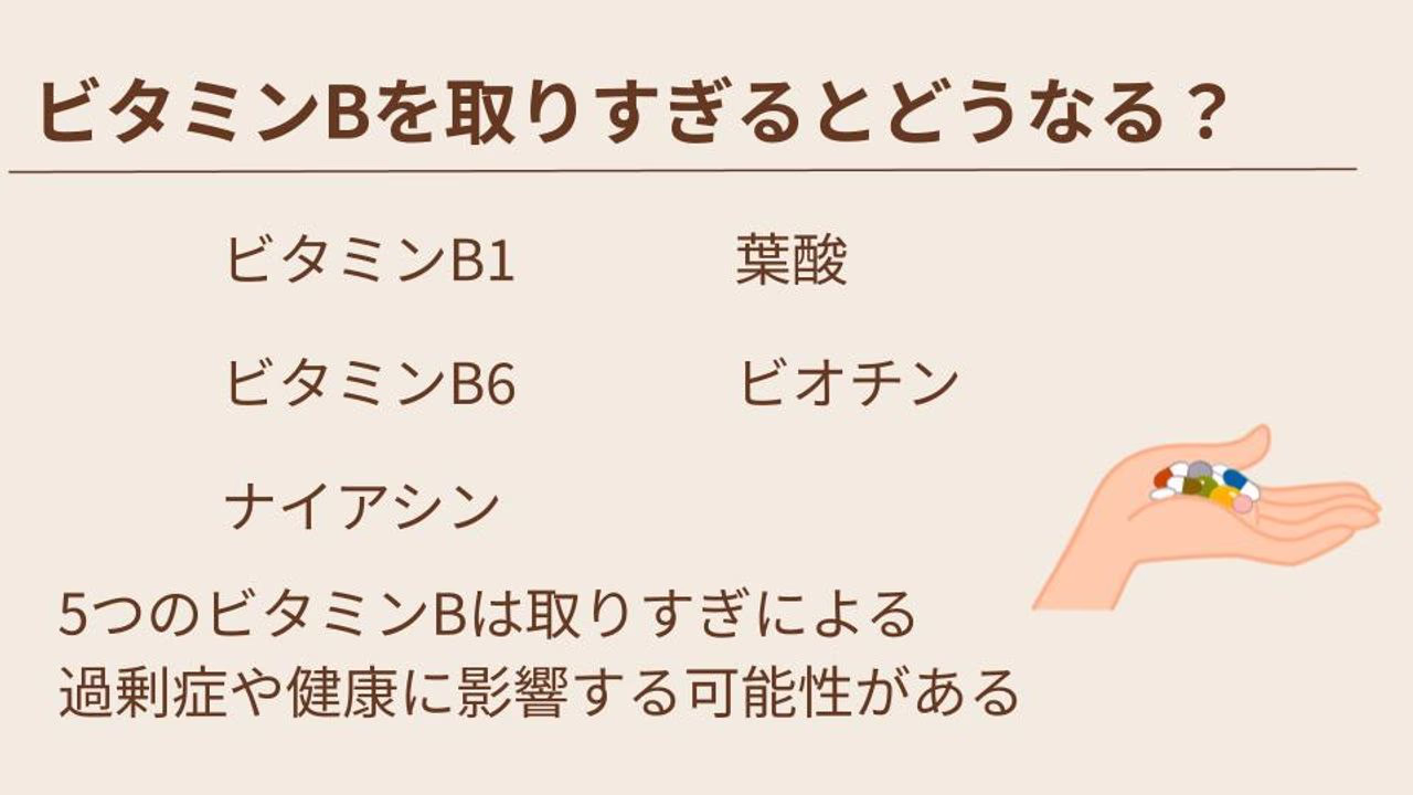 ビタミンBのうち、ビタミンB1、B6、ナイアシン、葉酸、ビオチンはとり過ぎると、体に悪影響を及ぼすリスクがあります。かと言って、ビタミンBが不足しても健康に悪影響を及ぼすので、過不足なくビタミンBを取ることが重要です。
