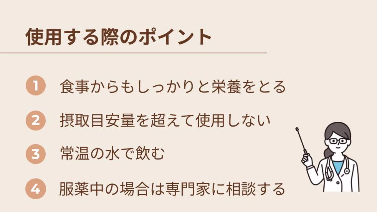 サプリメントは、多く飲めば効果が現れるというものではありません。反対に、栄養素によっては過剰摂取で不調を感じる可能性があります。