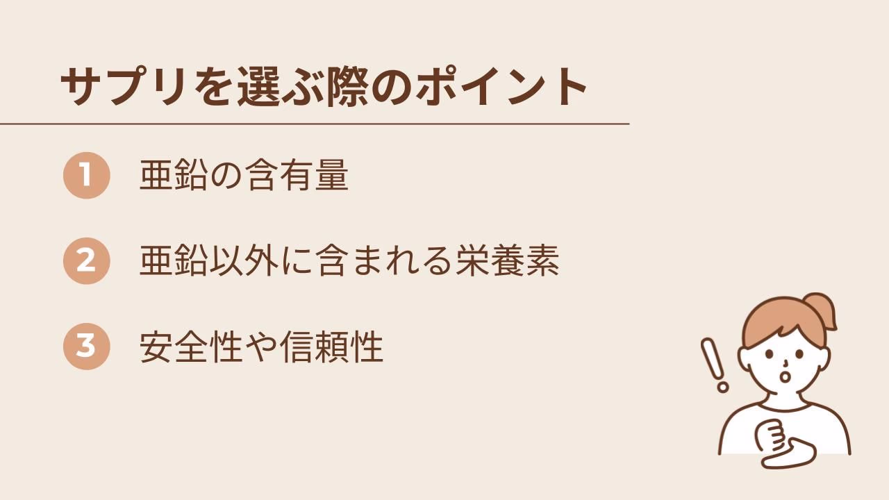 日常の食事からの亜鉛摂取量を考慮し、6mgほどのサプリメントを選びましょう。