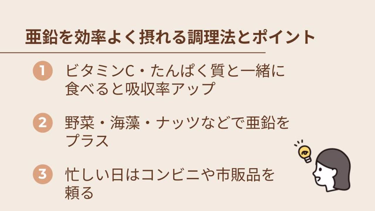 - 亜鉛を効率よく摂れる調理法や食べ方のポイント
