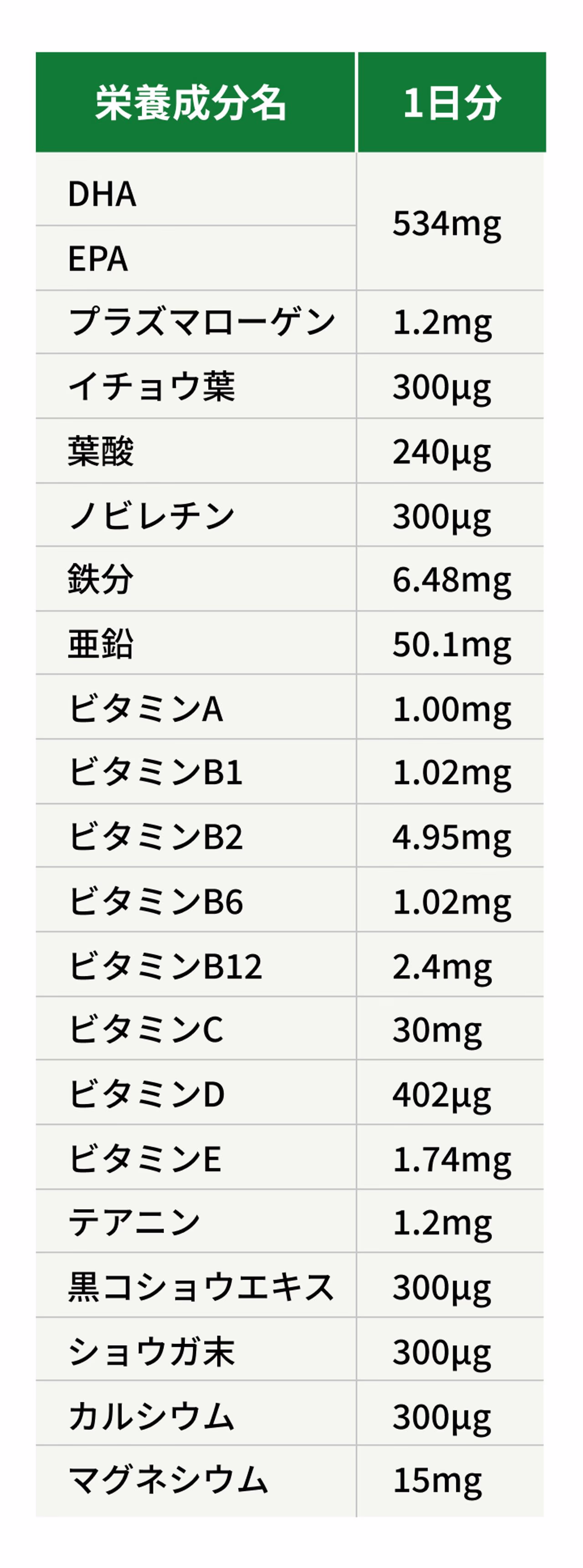 年齢とともに気になりやすいだるさ、記憶力・集中力の低下など、複数の悩みに関わる栄養素を一度に補えるため、日々の体調管理をシンプルに整えられます。