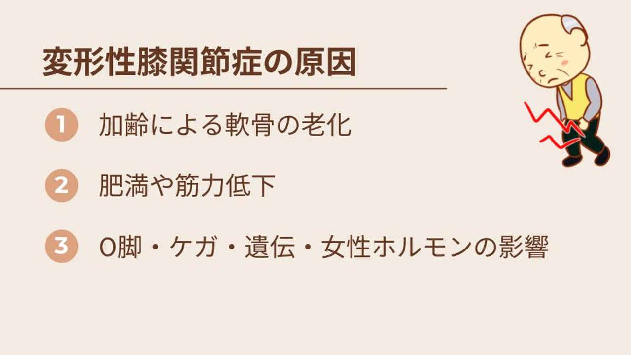 変形性膝関節症は、加齢に伴う膝軟骨の老化だけでなく、体重の増加や筋力低下、O脚などの骨格の歪みも原因となります。