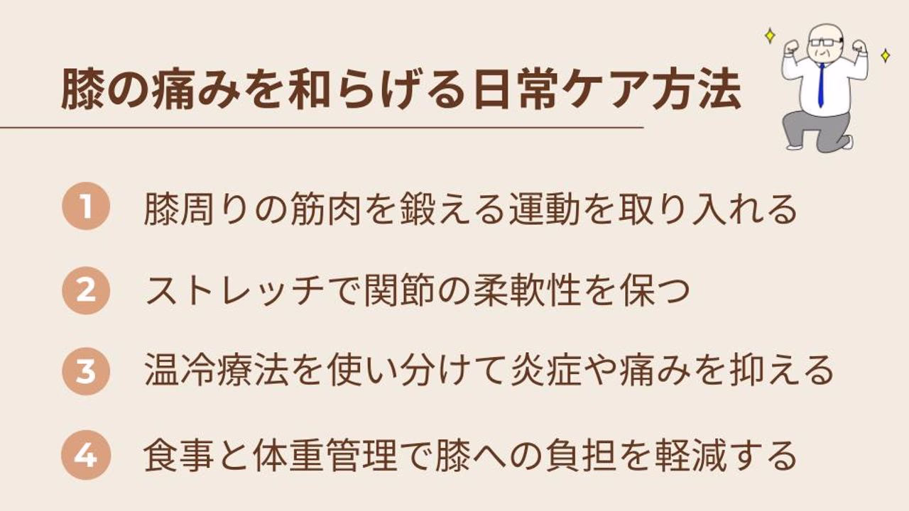 ここでは膝の痛みを和らげるための日常ケア方法について紹介します。