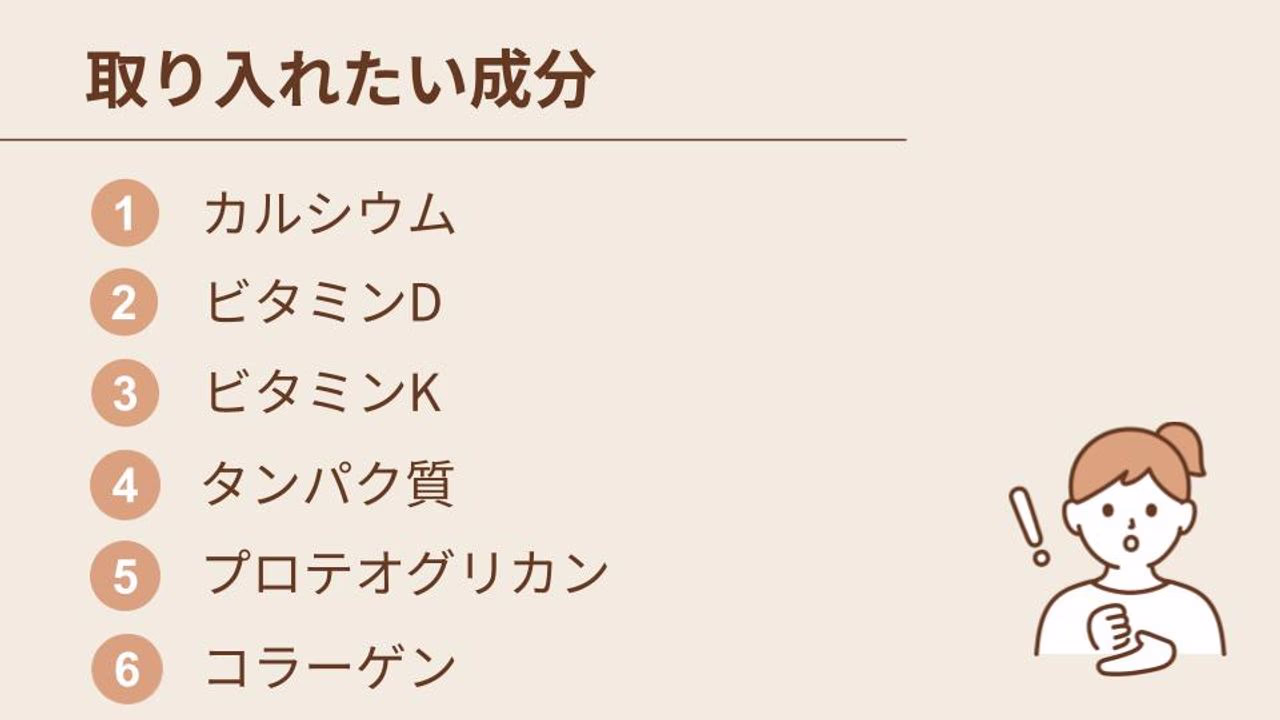 カルシウムは、骨の強度を保つために大切な栄養素です。カルシウムが豊富な食材には、牛乳やしらす干し、ひじきなどが挙げられます。