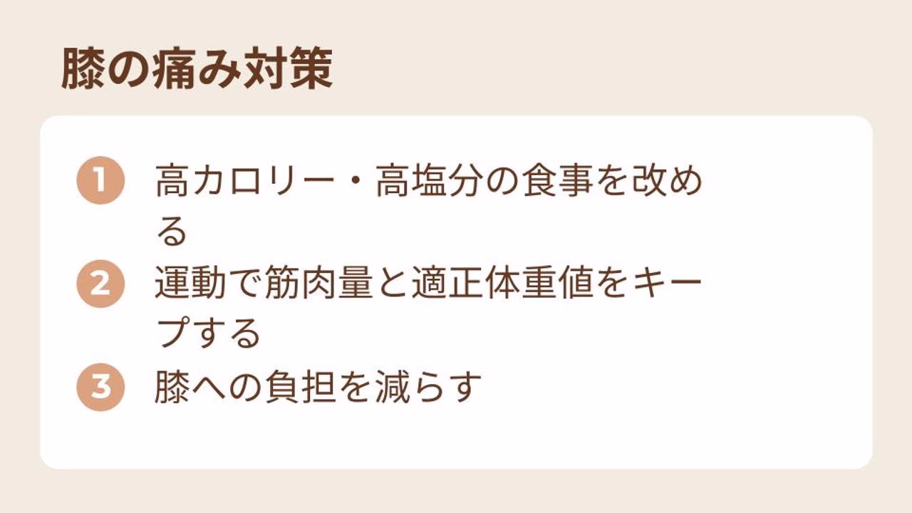 肥満の原因となる高カロリー・高塩分の食事は控えるようにしましょう。肥満は膝への負担を増やすため、体重管理は大切です。
