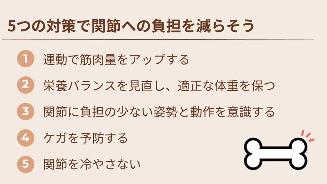 関節炎は加齢や病気などが引き金となりますが、骨や筋肉に負担がかかっていることも悪化の要因です。普段の生活習慣の中で、骨や筋肉の負担を減らすための対策を取り入れていきましょう。