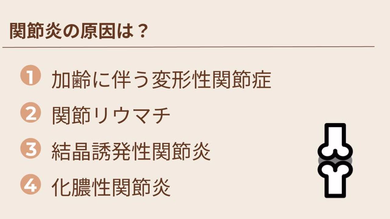 関節炎の原因は複数あります。年齢のせいというイメージがありますが、病気やケガが原因になることもあるので、決めつけるのは危険です。