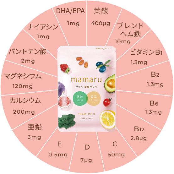 赤ちゃんの健康リスクを減らす葉酸をはじめ、妊娠期に特に不足しがちな鉄分、ビタミン、ミネラルなど妊娠初期から後期までの不足しがちな栄養素を配合。ママと赤ちゃんに必要な栄養素をまんべんなくサポートしています。