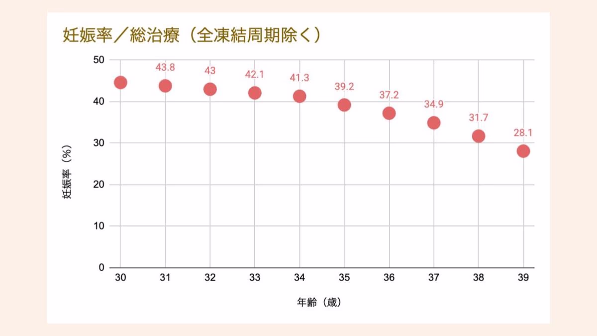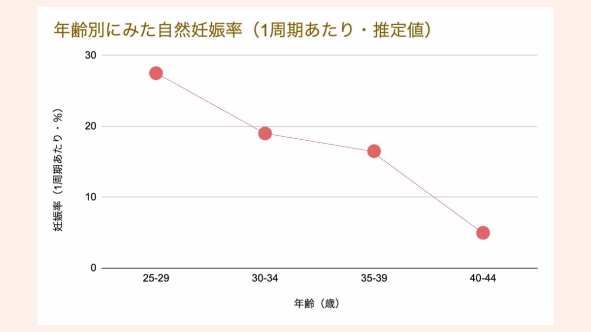 一般的に、1周期あたりの自然妊娠率は30代前半では20%近く、30代後半になると10%台まで下がる傾向があります。
