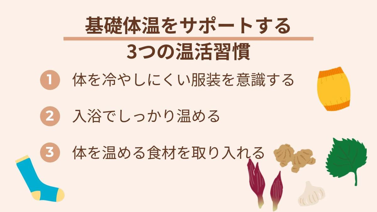 また、体を温める食材を食事に取り入れたり、腹巻や靴下で直接温めたりするのも効果的です。