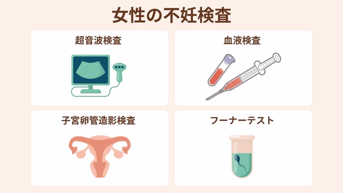 | ・超音波検査 ・血液検査 ・フーナーテスト | ・精液検査 ・泌尿器科的検査 (血液検査やエコー検査など) |