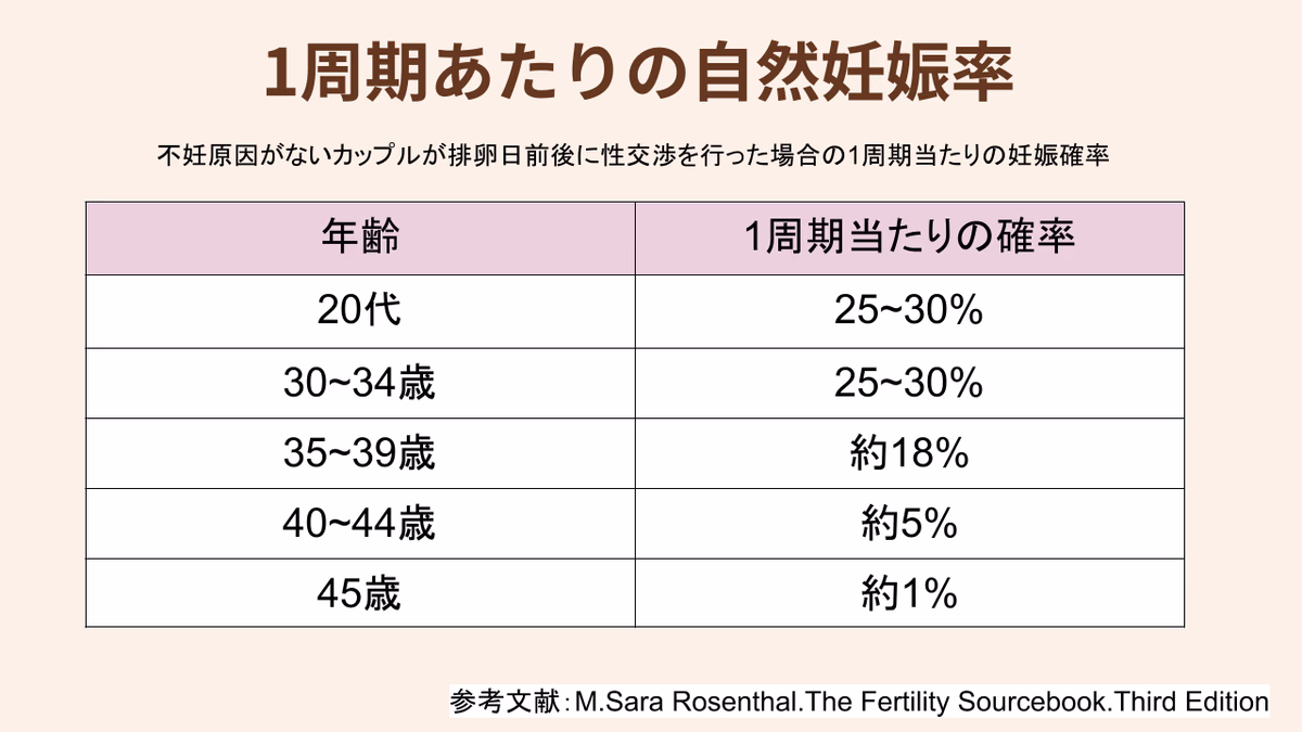 自然妊娠率も年齢を重ねるとともに低下し、40歳を過ぎると数%程度です。