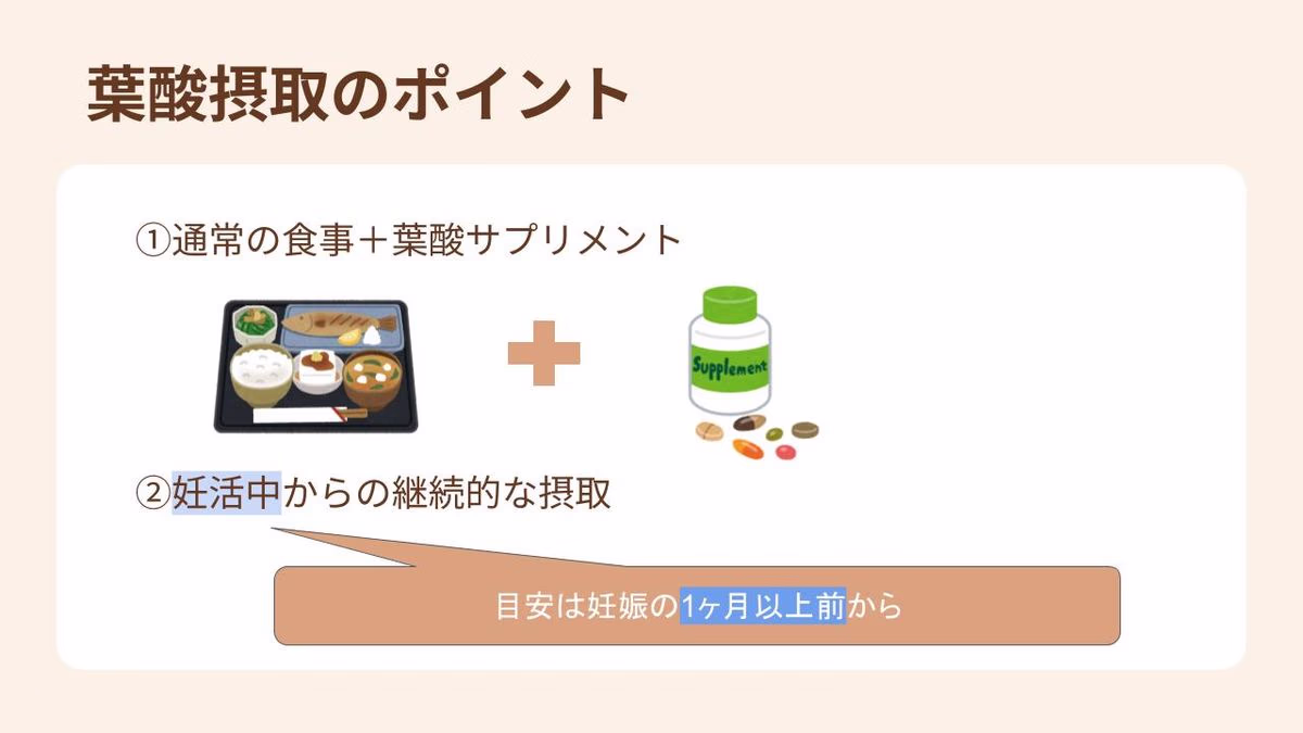 葉酸の摂取は、妊娠の1ヶ月前から始めることが大切です。