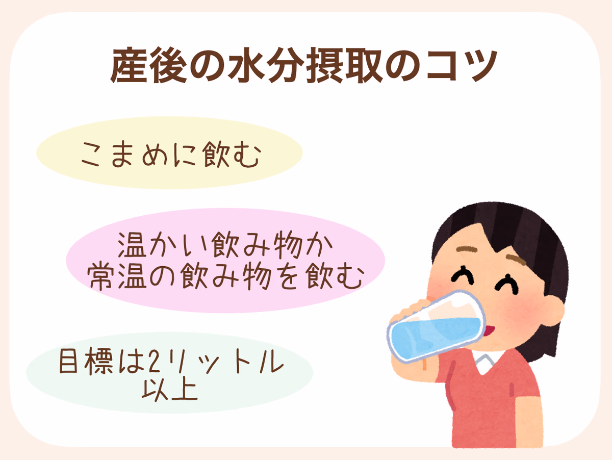 そのため、産後の水分摂取は2リットル以上を目標に摂取するようにしましょう。