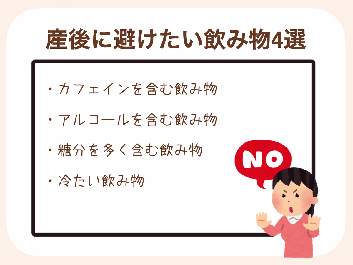 また、産後は飲み物以外にも、避けたいことがいくつかあります。こちらの記事もあわせて参考にしてみてくださいね。