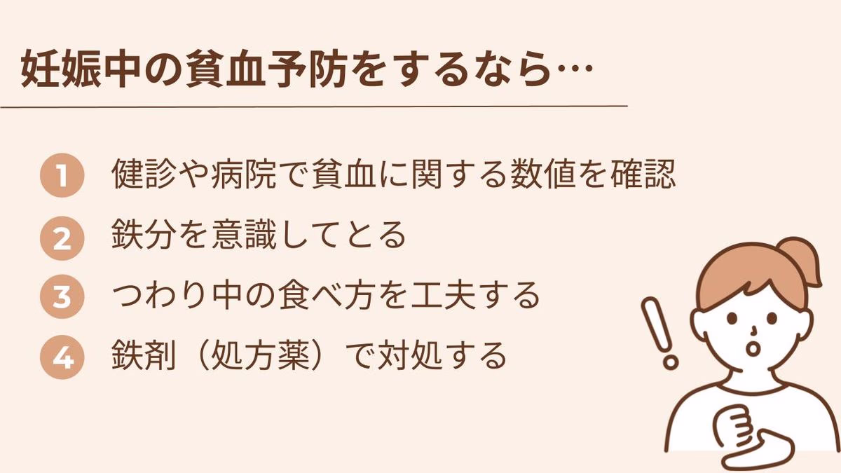 妊娠中の貧血は、検査結果に合わせて対策を取ることで予防や改善につなげられます。