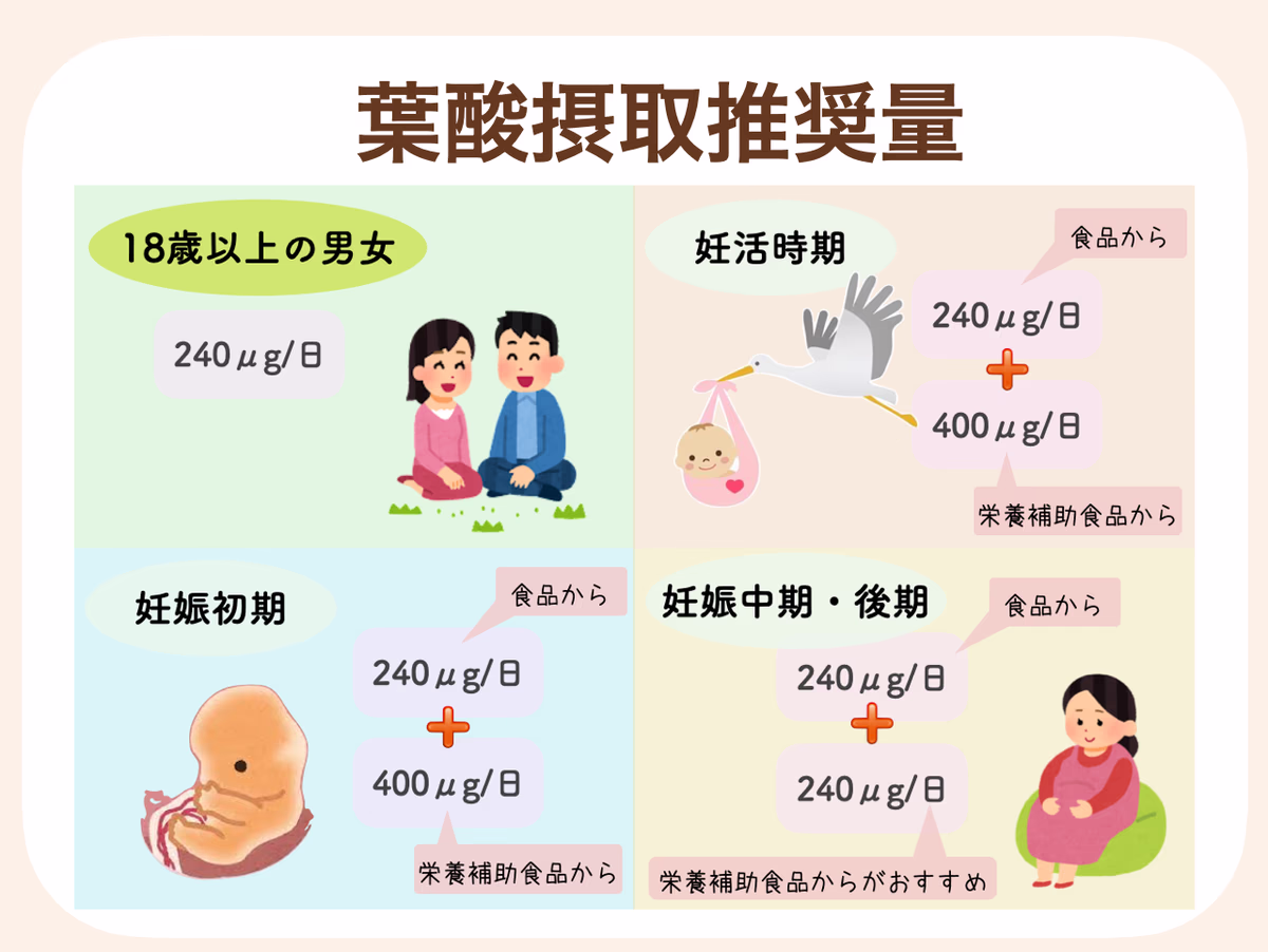 妊活中や妊娠初期には、赤ちゃんの器官形成期に備えて葉酸の需要が高まるため、1日あたり240μgに加えて400μgの合計640μg。