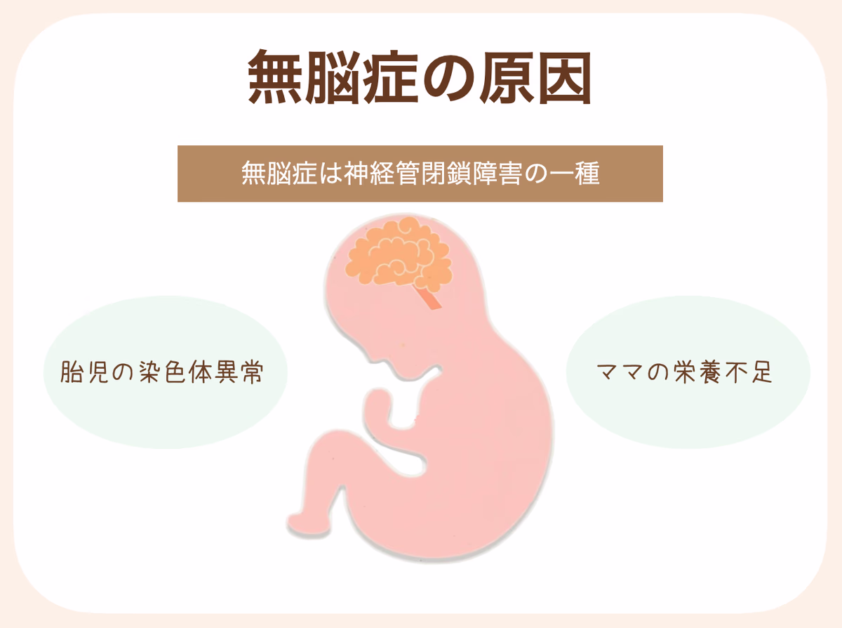 無脳症や神経管閉鎖障害が起こる原因には、胎児の染色体異常とママの栄養不足などがあります。