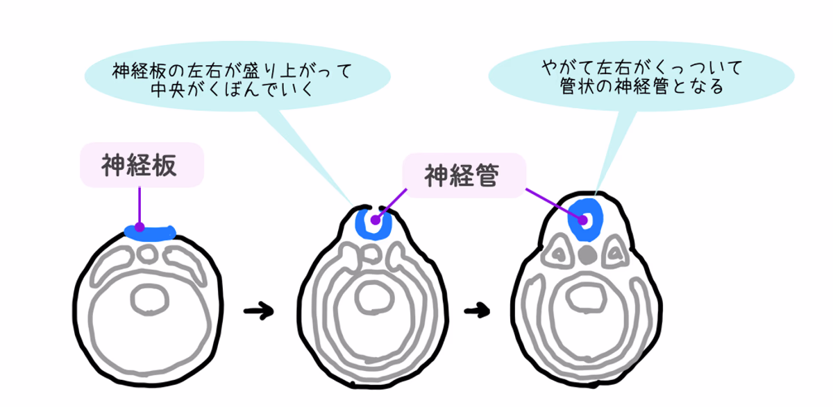 そもそも神経管とは、人間の全ての神経系のもととなる神経板(しんけいばん)という一枚の板状の組織からできています。
