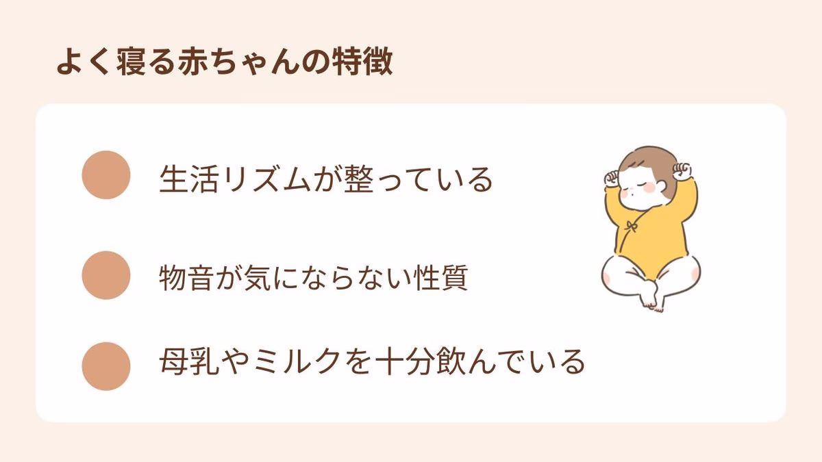 よく寝る赤ちゃんは、これらの特徴を持っていることが多いです。