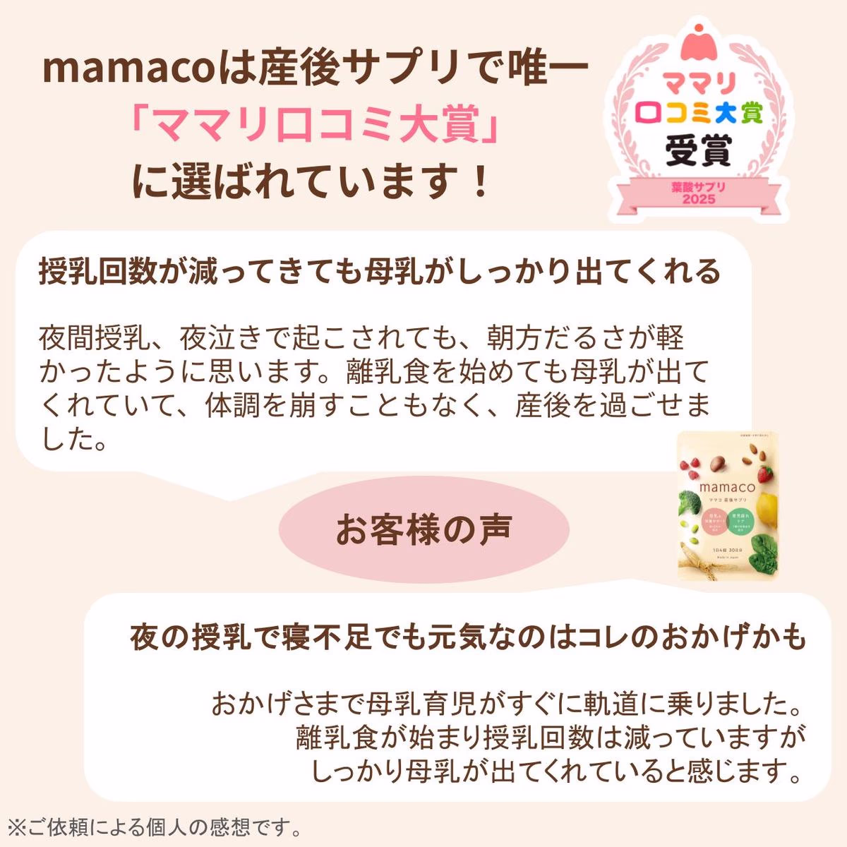 赤ちゃんがお腹いっぱい母乳を飲めているかが心配なママは、産後・授乳期のママに特化したサプリメント「mamaco」をお試しください。
