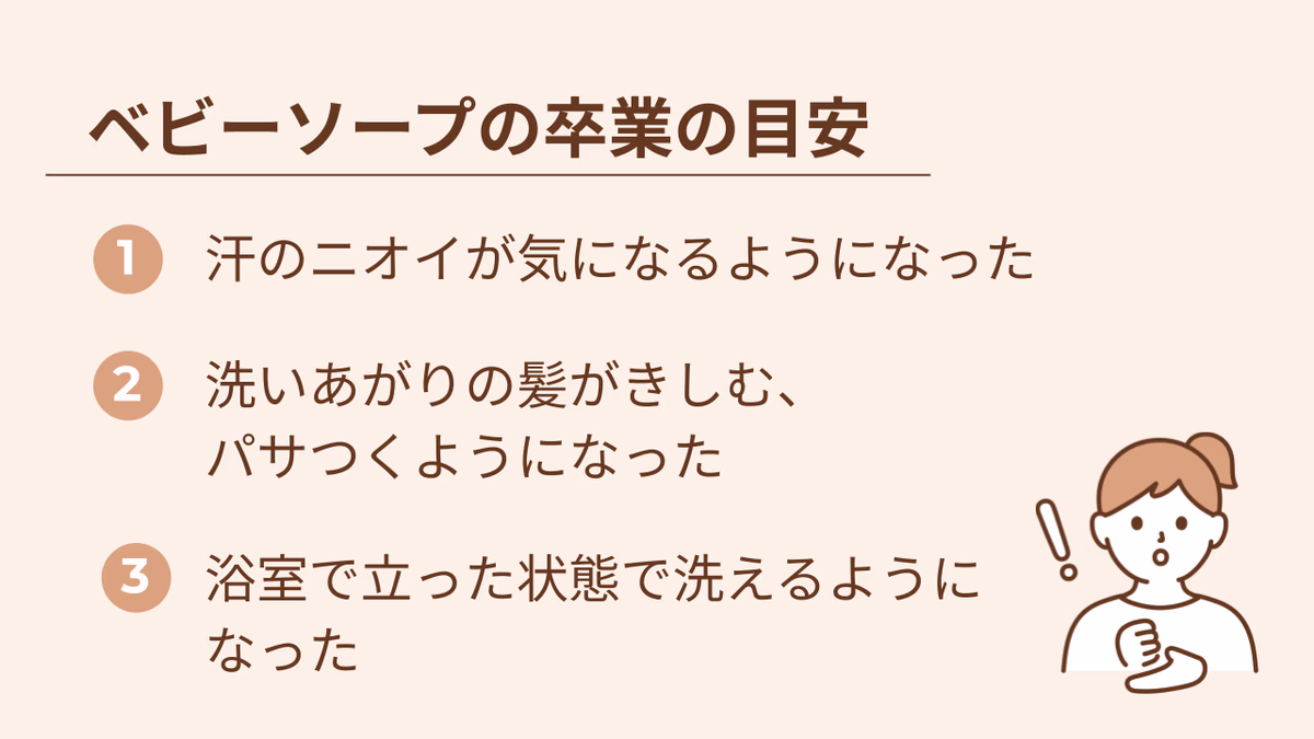 赤ちゃんの成長スピードは人それぞれ。ママやパパが「ベビーソープでは物足りない」と思った時が卒業のタイミングです。