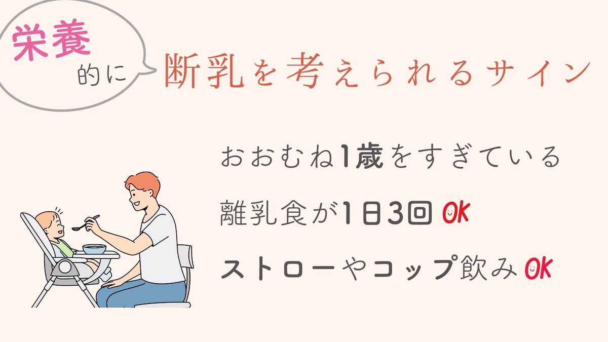 いわゆる離乳完了期以降で、固形物を噛んで食べられるようになっているようなら、栄養面では母乳の必要性は低く、卒乳の時期といえます。