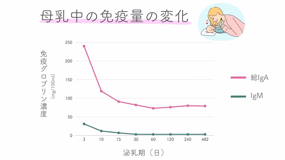グラフから、母乳中の免疫物質(総IgAとIgM)の量が、下記のように変化していることがわかります。