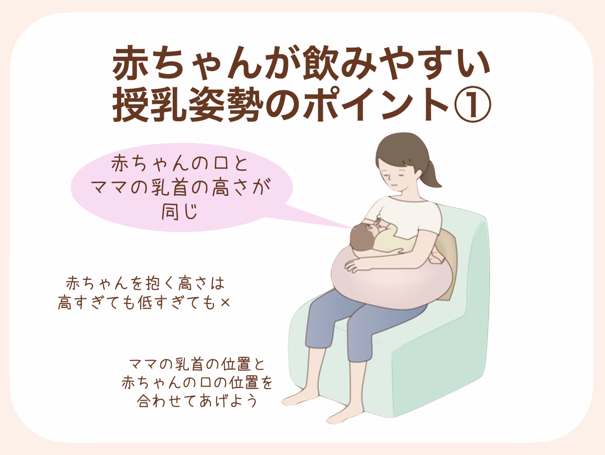授乳クッションや枕、バスタオルなどを使って、赤ちゃんの口とママの乳首の高さをそろえて授乳をしましょう