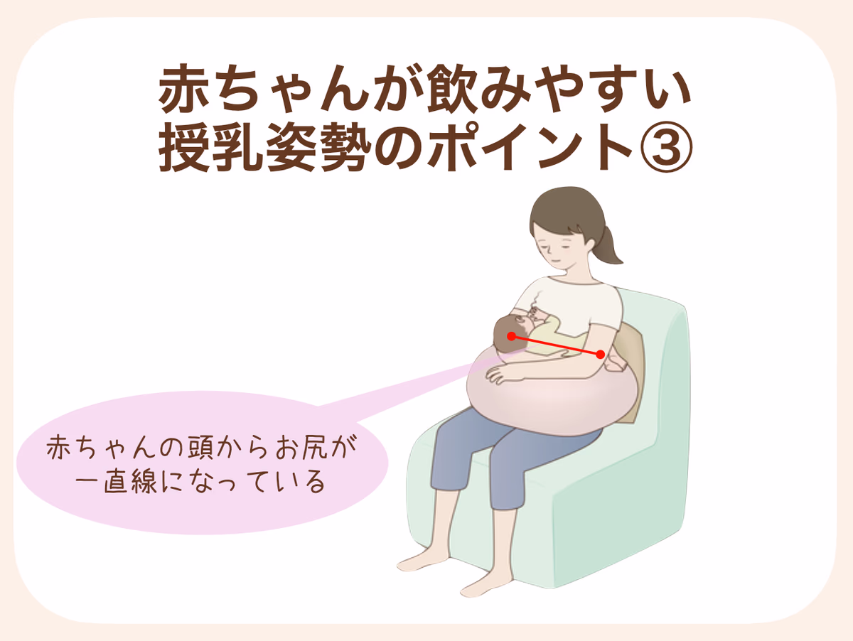 授乳中は首が傾いた姿勢になることがないよう、赤ちゃんの頭からお尻までが一直線上にくるようにします。