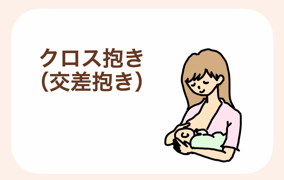 クロス抱き(交差抱き)は、赤ちゃんを横向きに寝かせ、ママの手で赤ちゃんの頭を支えて授乳する抱き方です。