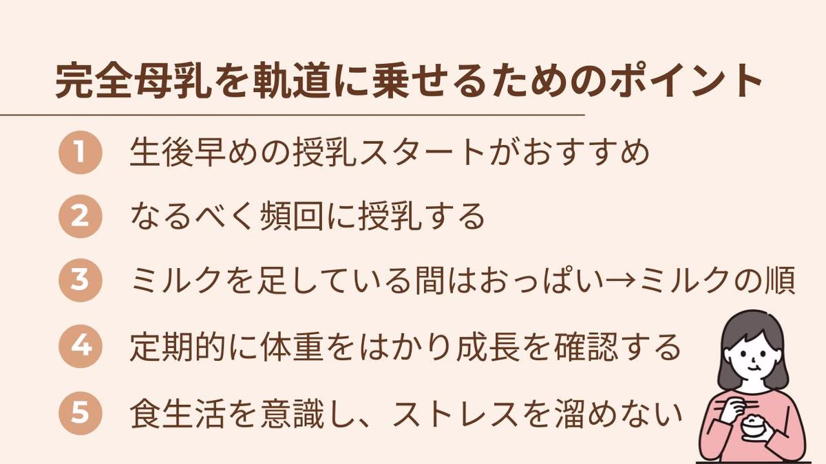 ここでは、完全母乳を軌道に乗せるためのポイントを解説します。