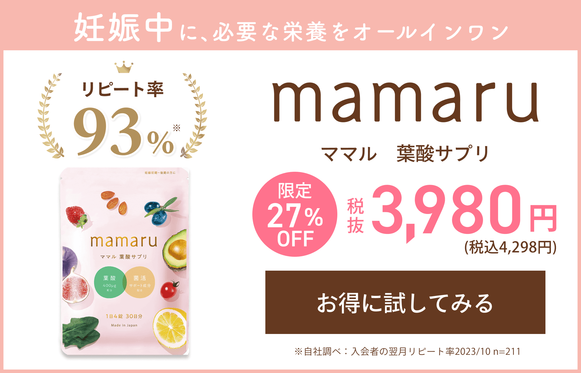 そして、安静が必要なママと急成長を続ける赤ちゃんに必要な栄養は、妊婦さん向けサプリmamaruでしっかり補ってください。