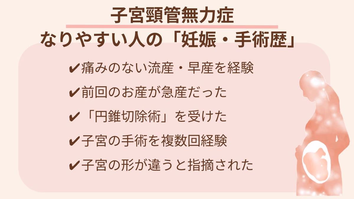 子宮頸管無力症は誰にでも起こる可能性があります。ただ、過去の妊娠歴や手術歴によっては、リスクが高まることがわかっています。