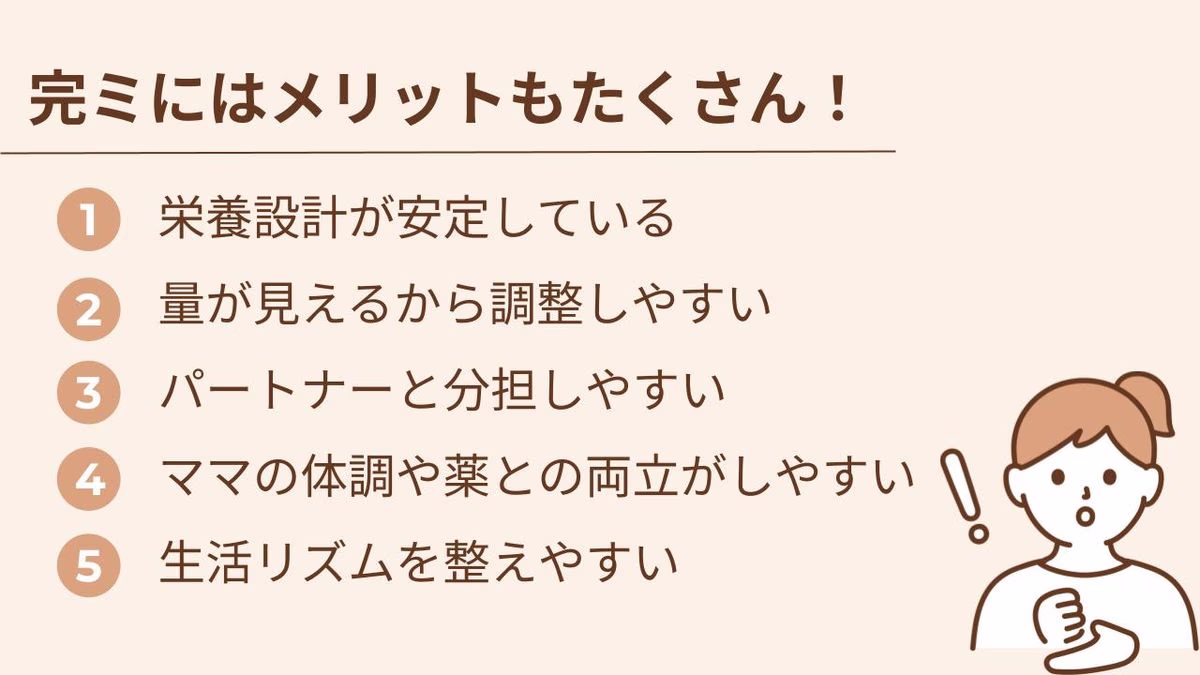 完ミには、費用や手間などのデメリットがある一方で、量の管理がしやすい、家族で分担できる、ママの体調に合わせやすいといった大きなメリットもあります。